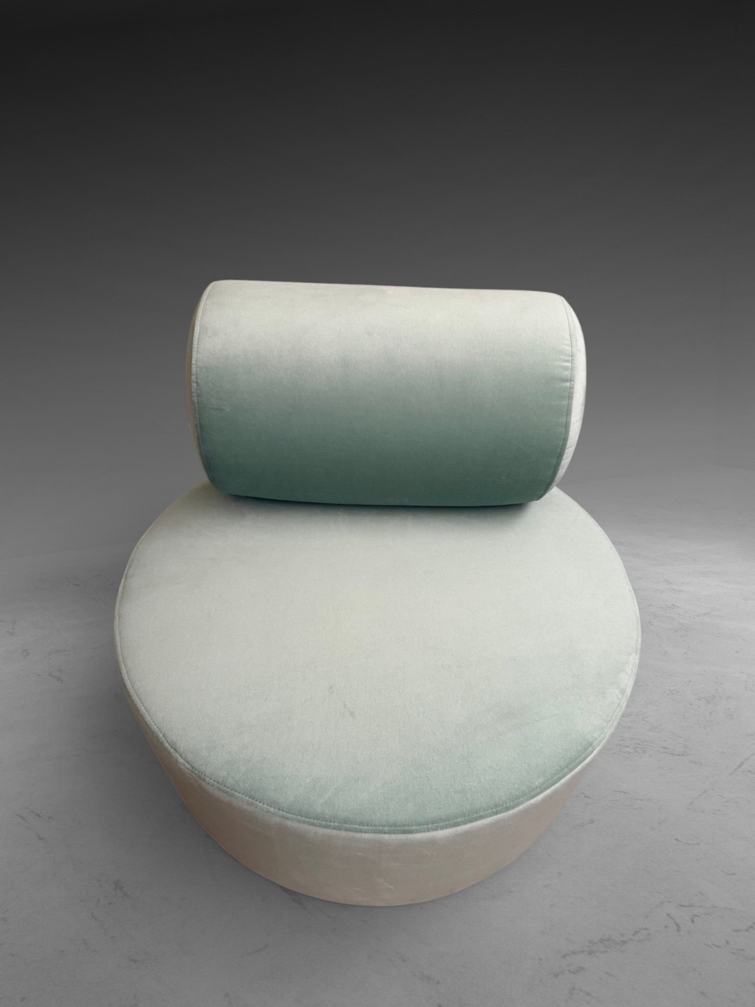 Le fauteuil Sinclair séduit par ses lignes douces et son design sculptural. Sa silhouette minimaliste associe une base cylindrique généreuse à un dossier en forme de rouleau, créant une assise confortable tout en apportant une touche graphique et contemporaine à l’espace.